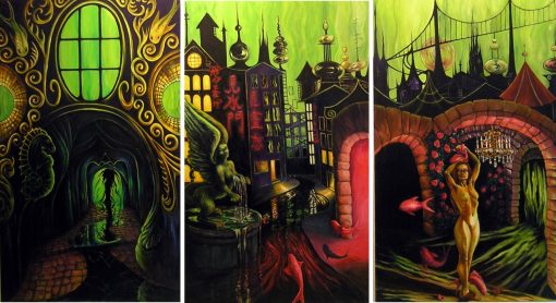This is from a dream wherein I wandered barefoot in a city that was haloed with green fire. There was a Patron Saint of Roses– although I only decided to give her that name upon waking. There was an immensity of city and of green. It was one of those dreams that only a painting can really talk about. It was extremely visceral and visual. A strange place, perhaps even dangerous, yet one where I felt happy to feel the warm cobblestones under my naked feet. The Patron Saint of Roses I took and rendered into the artist performing magic, in this case turning roses into flying pink fish by crushing them in her hands.